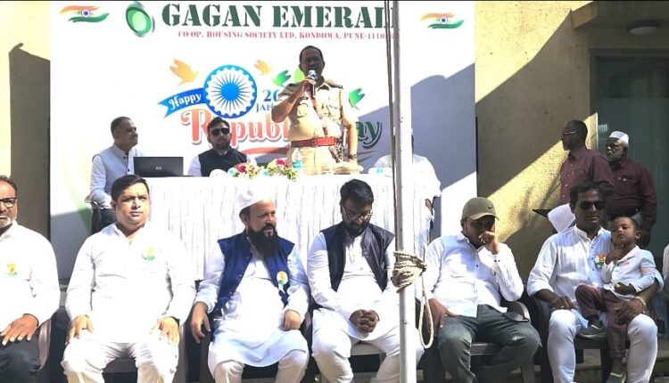 Pune Kondhwa-२६ जानेवारी २०२५ रोजी सकाळी १०:३० वाजता कोंढवा गगन एमराल्ड सोसायटीमध्ये प्रजासत्ताक दिनाचा उत्साही कार्यक्रम आयोजित करण्यात आला होता. कोंढवा येथील वरिष्ठ पोलीस निरीक्षक विनय पाटणकर यांनी ध्वजारोहण केले. गगन एमराल्ड सोसायटीच्या सर्व रहिवाशांनी त्यांच्या उपस्थितीने कार्यक्रमाची शोभा वाढवली. कार्यक्रमात कोंढवाचे वरिष्ठ पोलीस निरीक्षक विनय पाटणकर यांनी स्वतःच्या हातांनी मुलांना लाडू वाटले. गगन एमराल्डच्या अध्यक्षांनी society नियम लागू असलेल्या नियमांचे पालन करण्यास सांगितले.