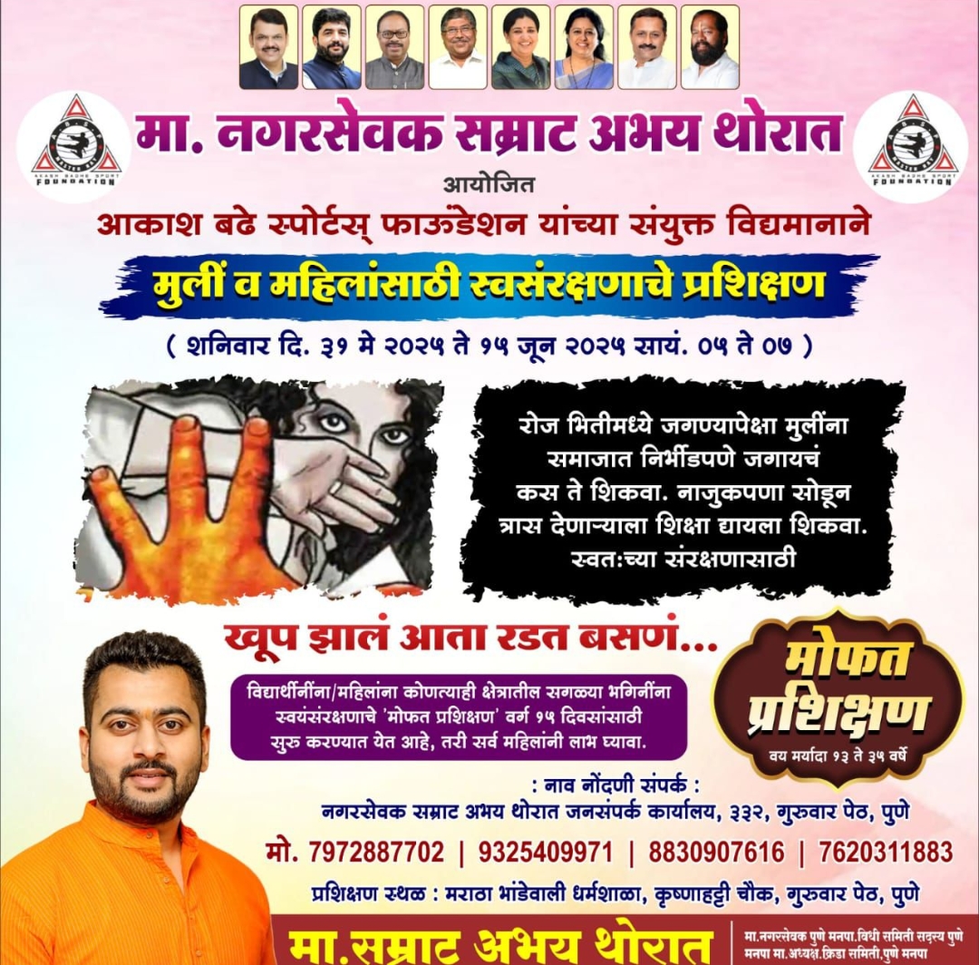 Pune-स्वतःचा बचाव… आता शिकूया स्वतः!” महिला व मुलींसाठी मोफत सेल्फ डिफेन्स शिबिर प्रिय भगिनींनो, आजच्या अश्रद्ध काळात “सुरक्षितता ही गरज नाही, तर तुमचा मूलभूत हक्क आहे!” तुमचा आत्मविश्वास वाढवणे, संकटकालीन परिस्थितीत धैर्याने तोंड देणे आणि “स्वतःला सक्षम करणे” यासाठी, सम्राट अक्षय थोरात घेऊन आले आहेत एक विशेष उपक्रम – तुमच्या हातात तुमची सुरक्षा!” ✨ या शिबिरातील विशेष घटक: ✅ प्रभावी सेल्फ डिफेन्स तंत्रे (व्यावहारिक प्रशिक्षण) ✅ मानसिक सामर्थ्य व त्वरित प्रतिक्रिया कौशल्य ✅ अनुभवी प्रशिक्षकांचे मार्गदर्शन ✅ भीतीवर मात करण्याची प्रेरणा “तुमच्यातच छुपी आहे शक्ती – फक्त तिला ओळखण्याची गरज आहे!” 📢 शिबिर पूर्णपणे मोफत आहे! ⏳ मर्यादित जागा, म्हणून आजच नाव नोंदवा! “सुरक्षित तुम्ही, सुरक्षित समाज!”– जनतेचा दादा, बहिणींचा विश्वास: सम्राट थोरात!